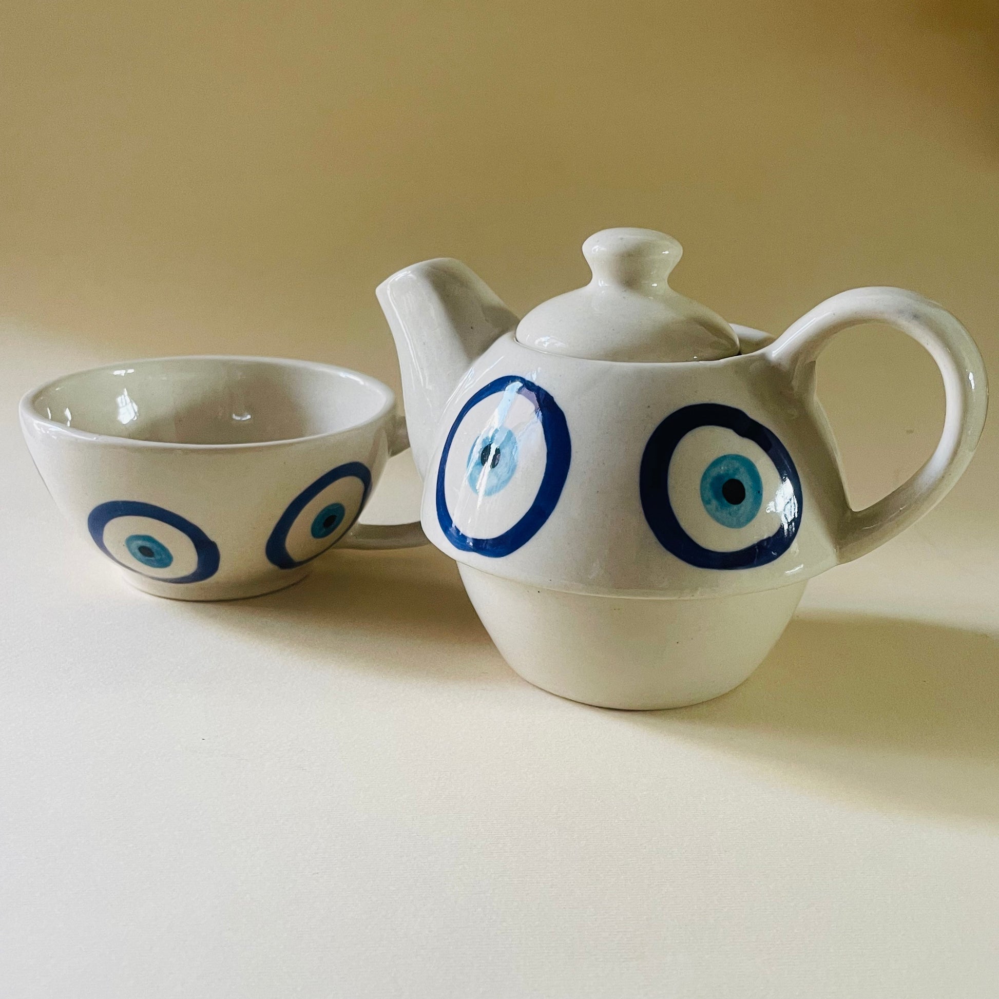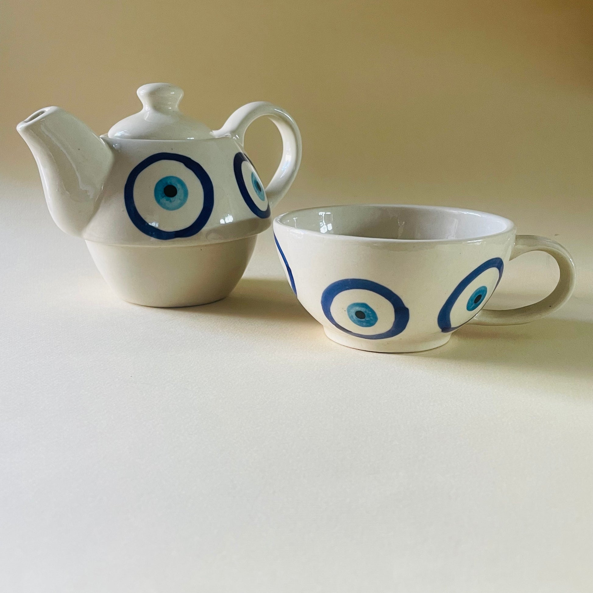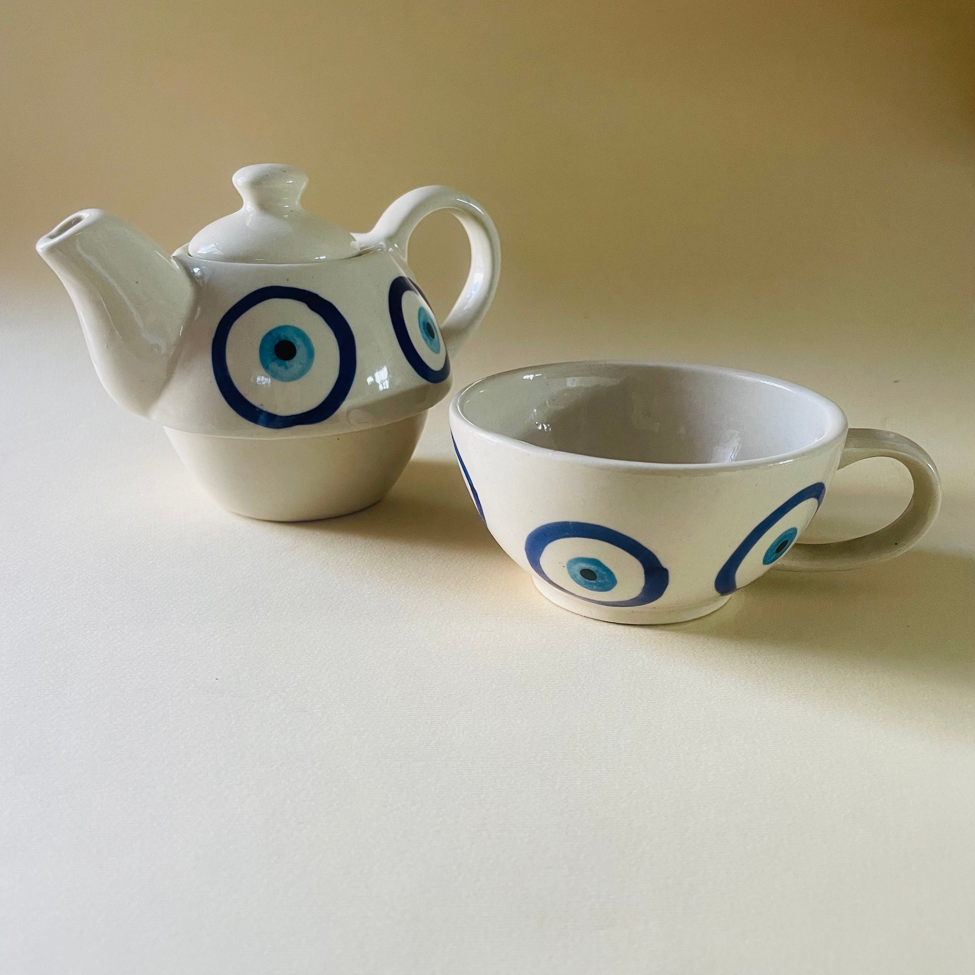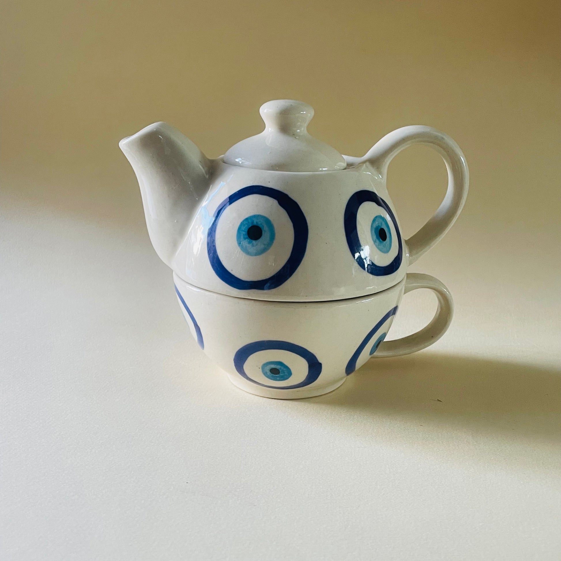 Add a touch of cultural symbolism and stylish charm to your teatime with this hand-painted Evil Eye teapot and cup set. With its striking blue concentric circle motif—known to symbolize protection and ward off negative energy—this 2-piece ceramic set is both meaningful and visually captivating. The teapot sits snugly atop the cup, making it a space-saving and aesthetic addition to your kitchen or tea corner.