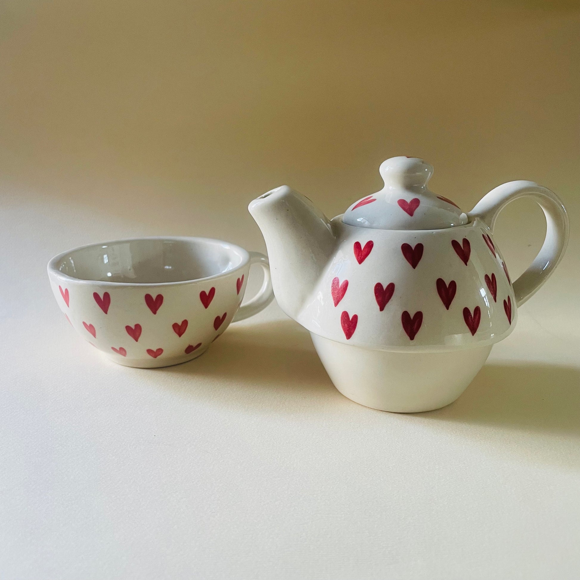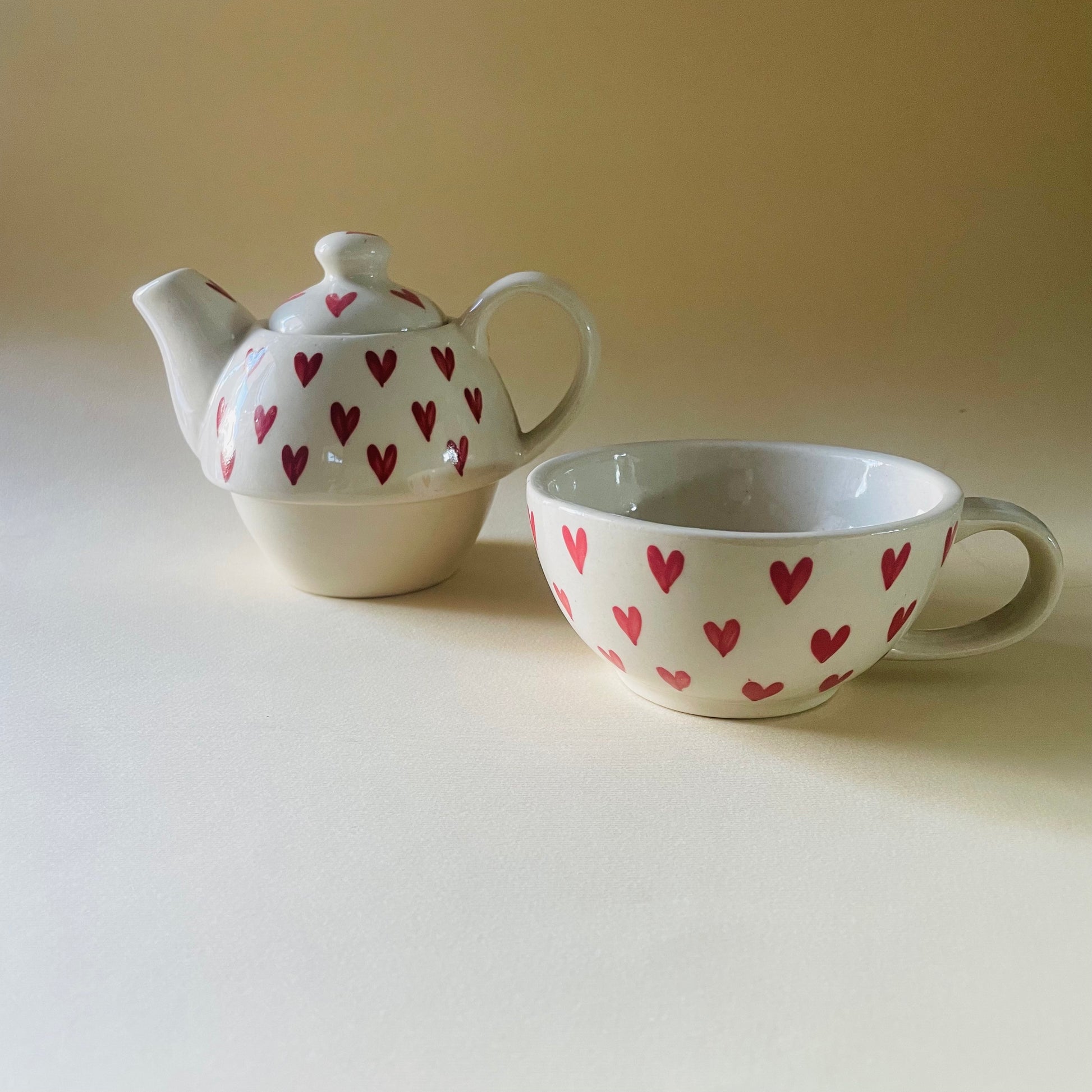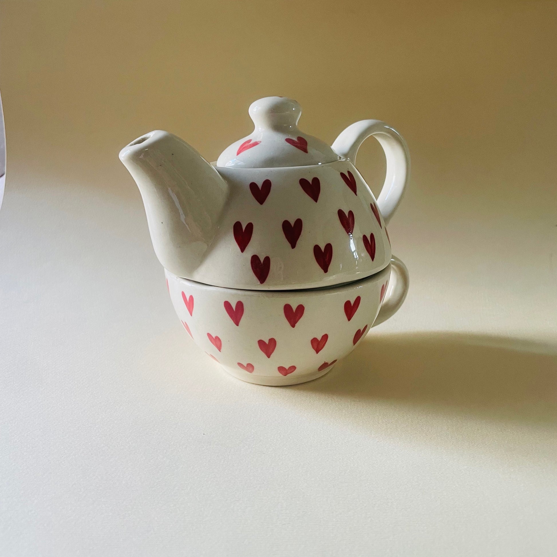 This charming 2-piece Tea set is the perfect companion for quiet mornings, cozy evenings, or gifting someone you love. With a delightful hand-painted heart design, this stackable teapot and cup combo radiates warmth and cheer. Designed to be as practical as it is pretty, the set saves space while making a bold visual statement.