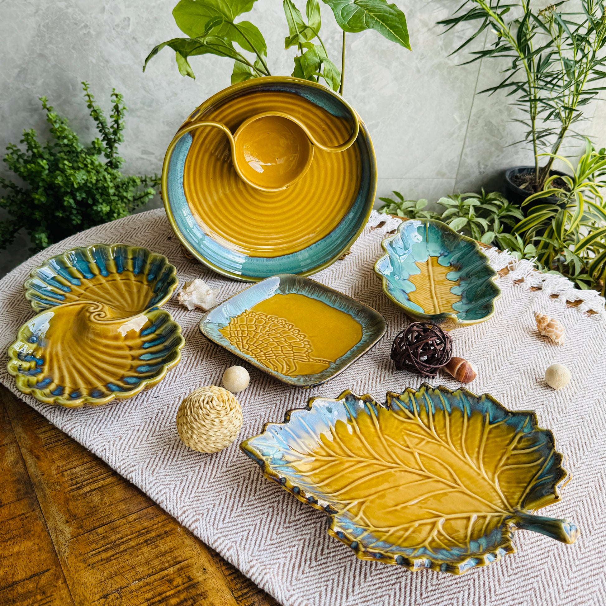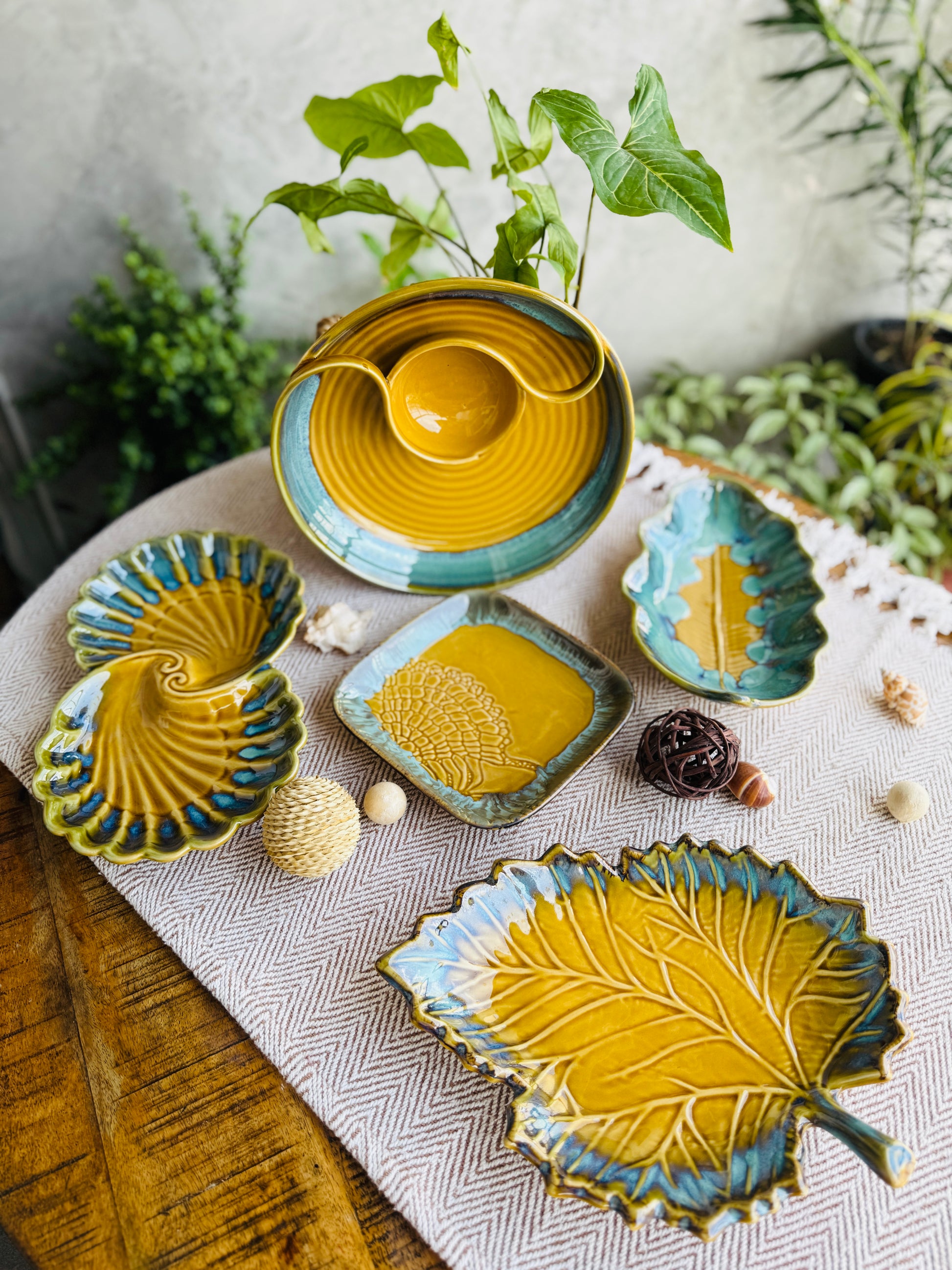 Introducing our Limited Edition Handcrafted Serving Platter Set, designed exclusively to add a touch of artisanal warmth to your festive table. Inspired by the organic beauty of nature, each piece in this collection showcases exquisite craftsmanship with motifs of leaves, waves, and shells — thoughtfully curated to blend tradition with modern sophistication.