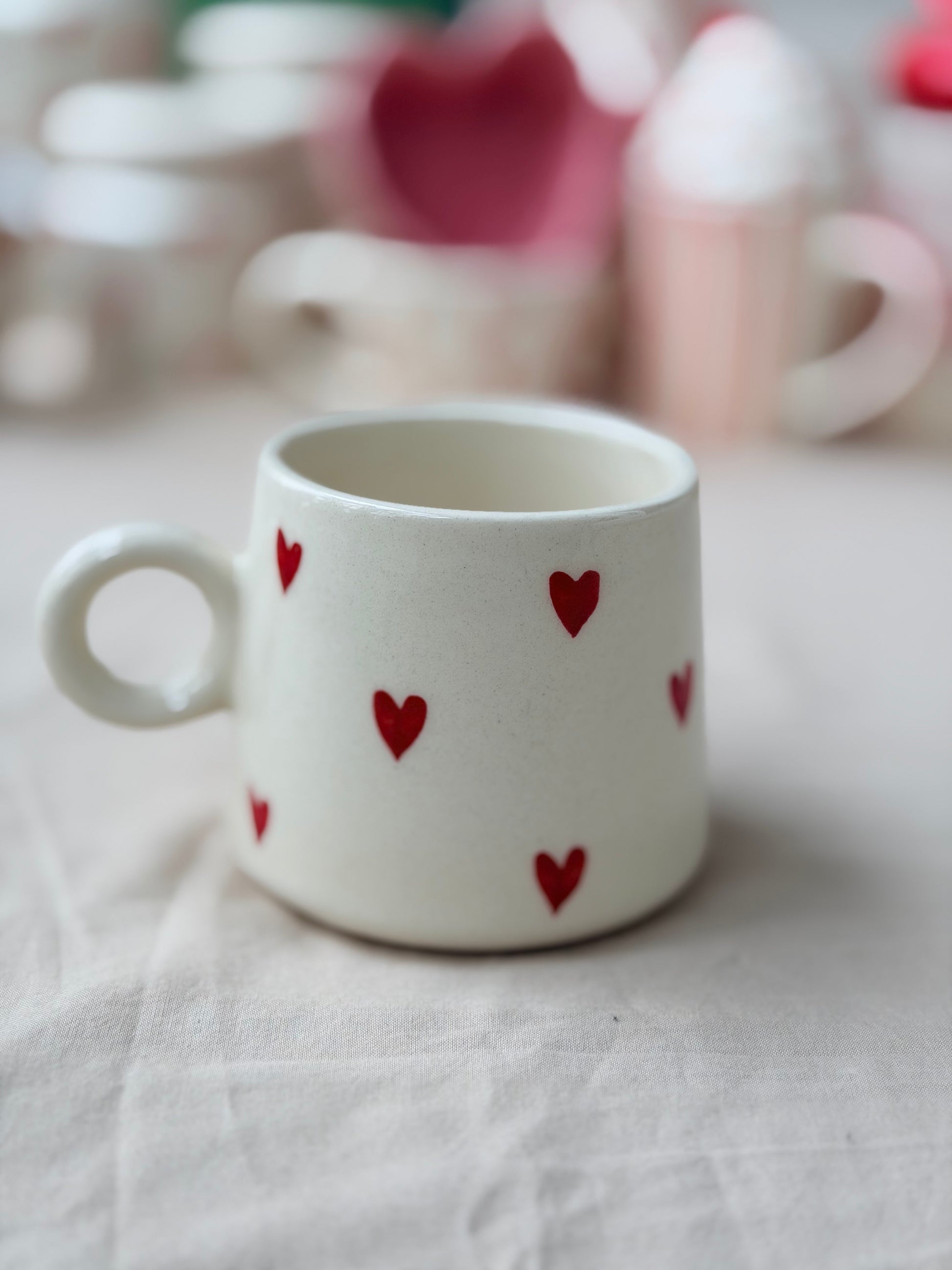 The Little Hearts Mug is a handcrafted ceramic mug adorned with hand-painted red hearts scattered gently across a soft off-white base. Designed for everyday use and everyday love, it’s the kind of mug you reach for without thinking — morning coffee, evening chai, or cozy cocoa moments.