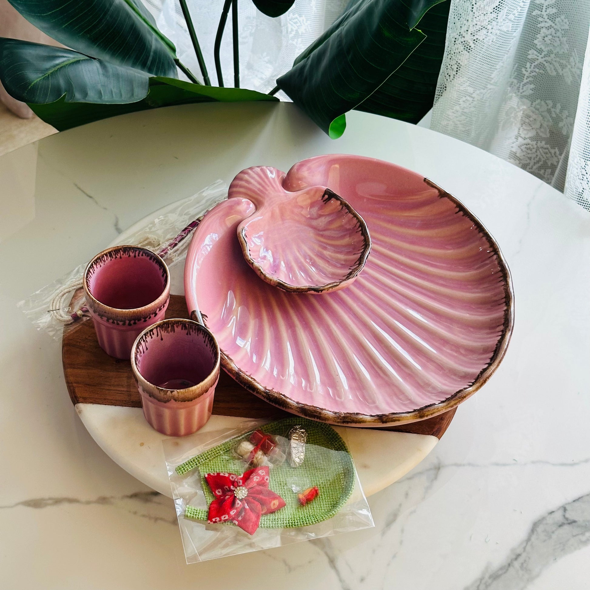 The set includes a Handcrafted Chip Dip Platter paired with Two Charming Tea glasses, perfect for festive servings or everyday indulgence. With its subtle glaze and artisanal finish, this set brings a refined yet cozy aesthetic to your Rakhi celebrations.