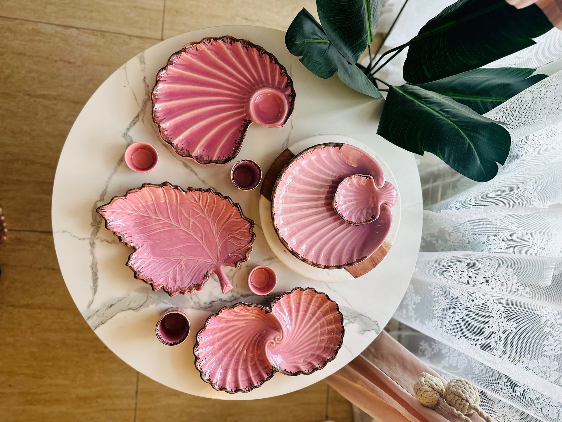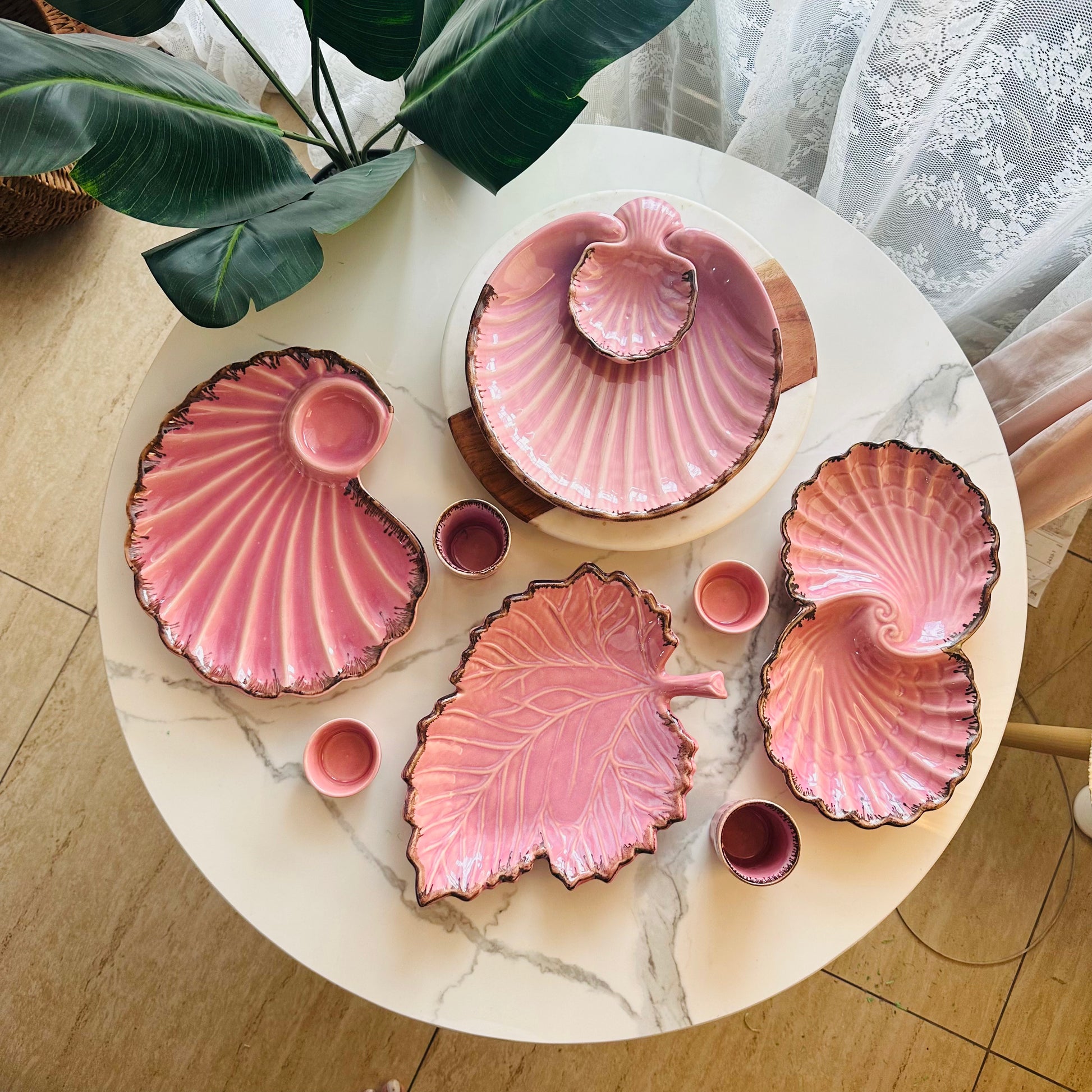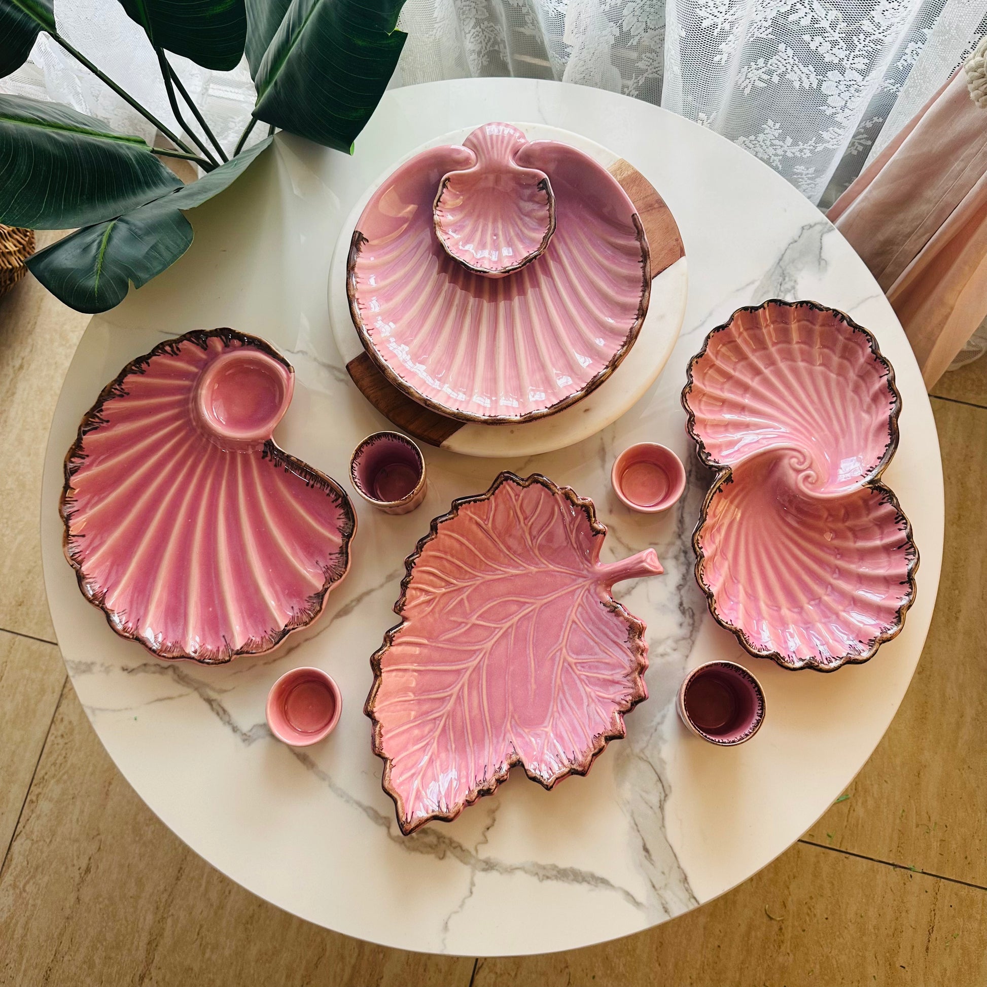 1 Leaf Platter in a glazed blush and olive-tone finish, with organic rim details — ideal for presenting dry fruits, Rakhi accessories, or festive appetizers.