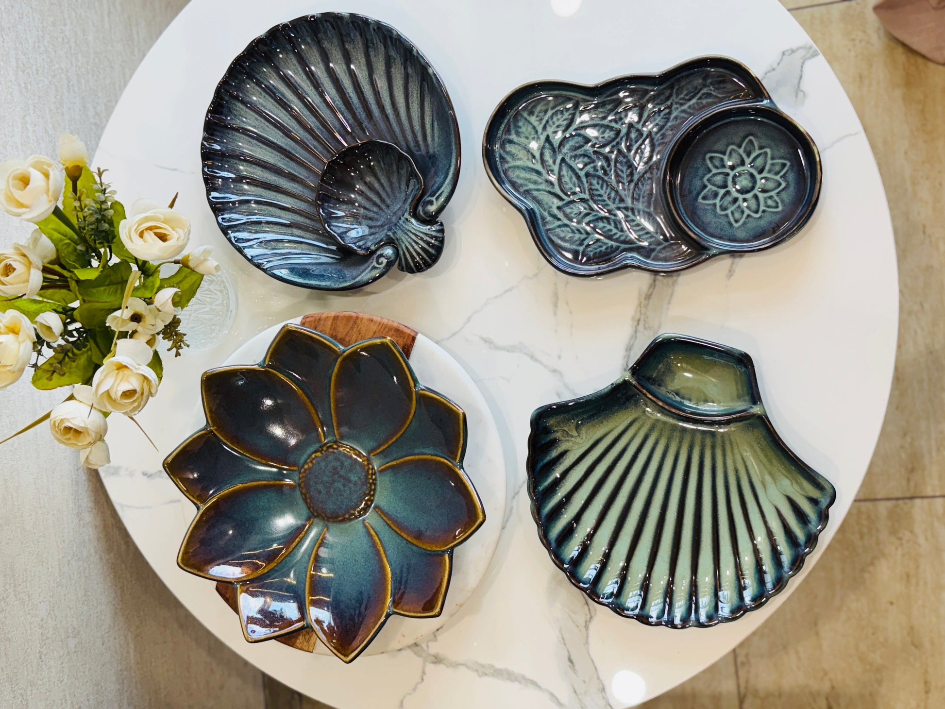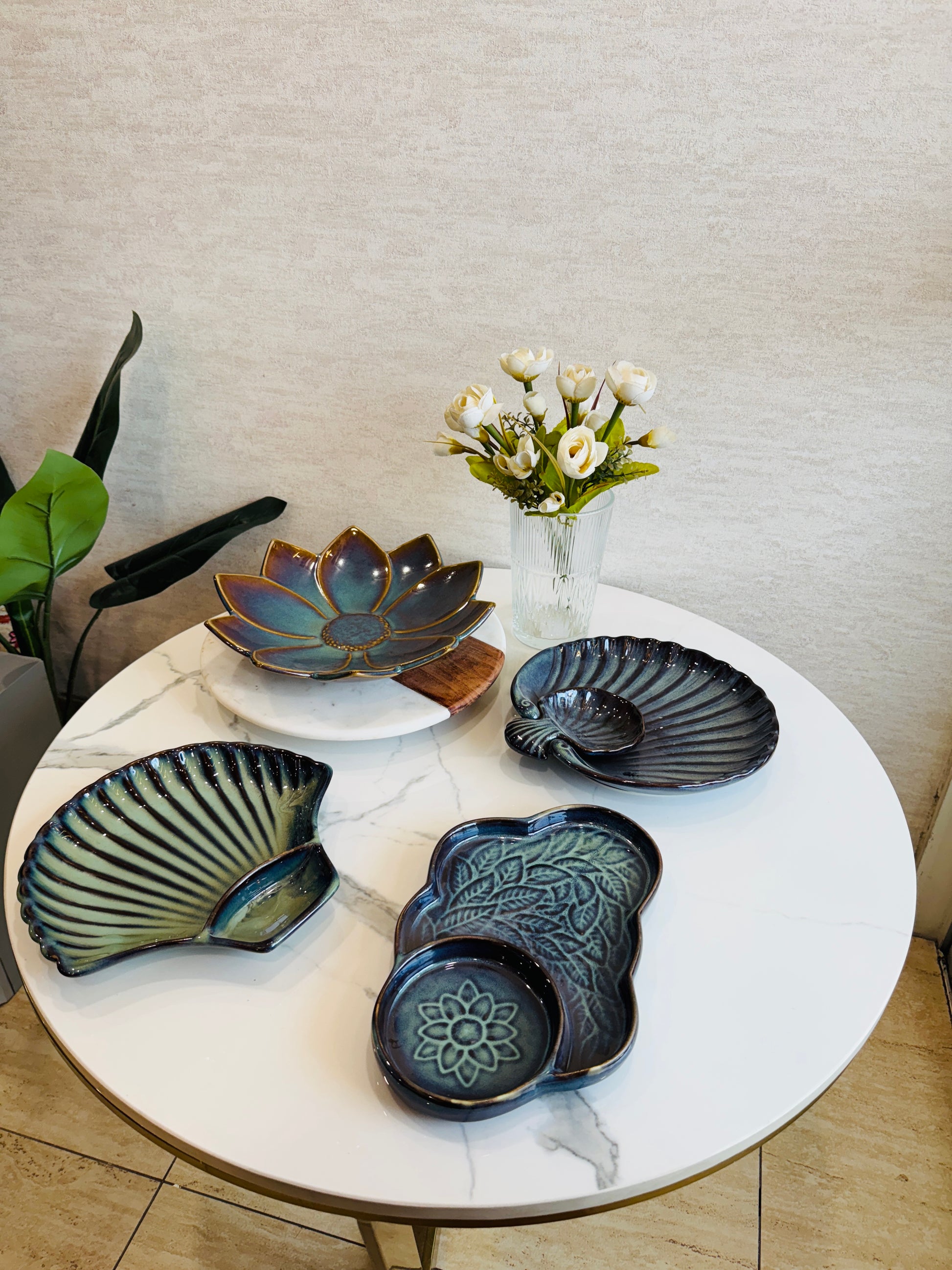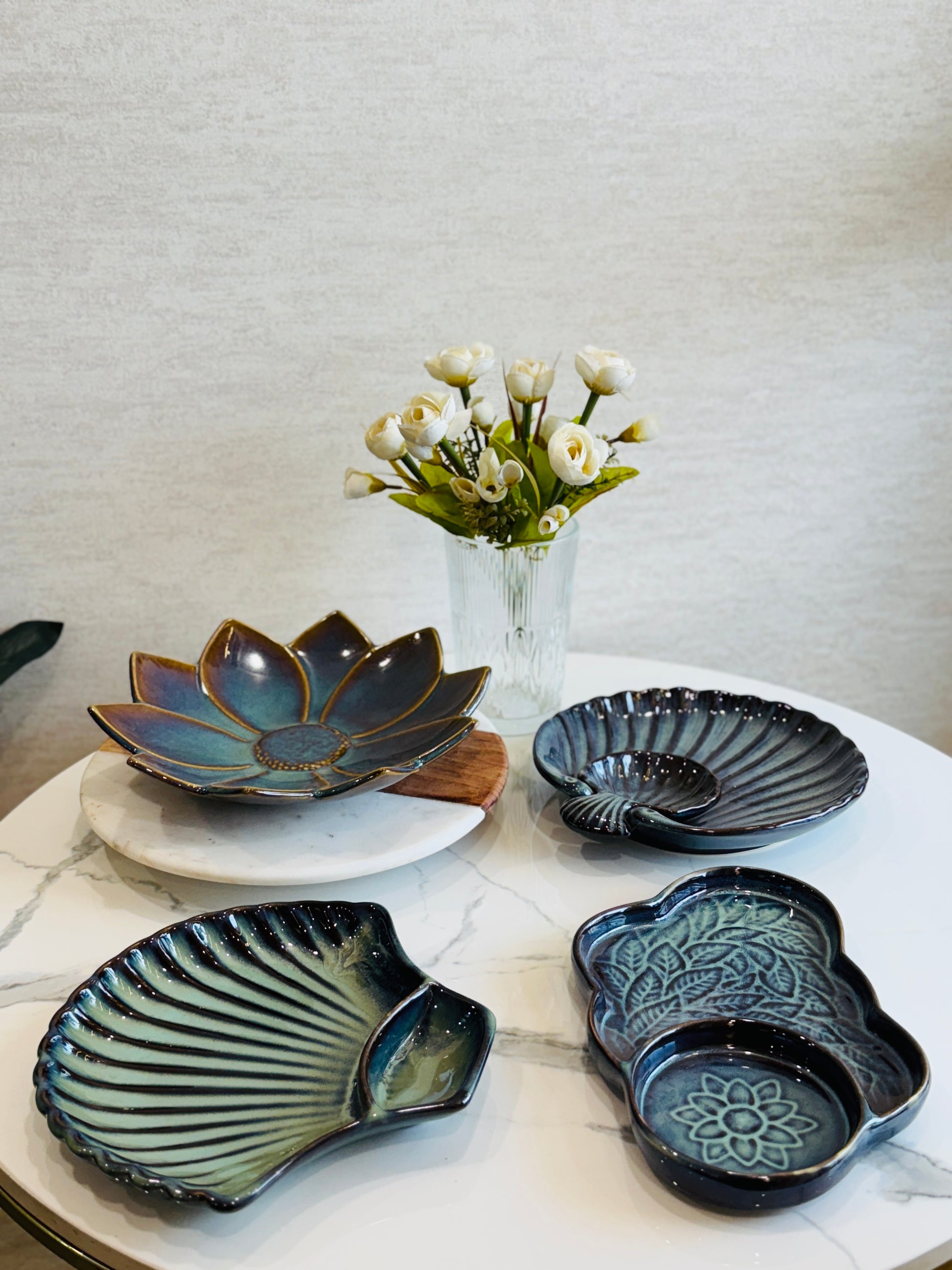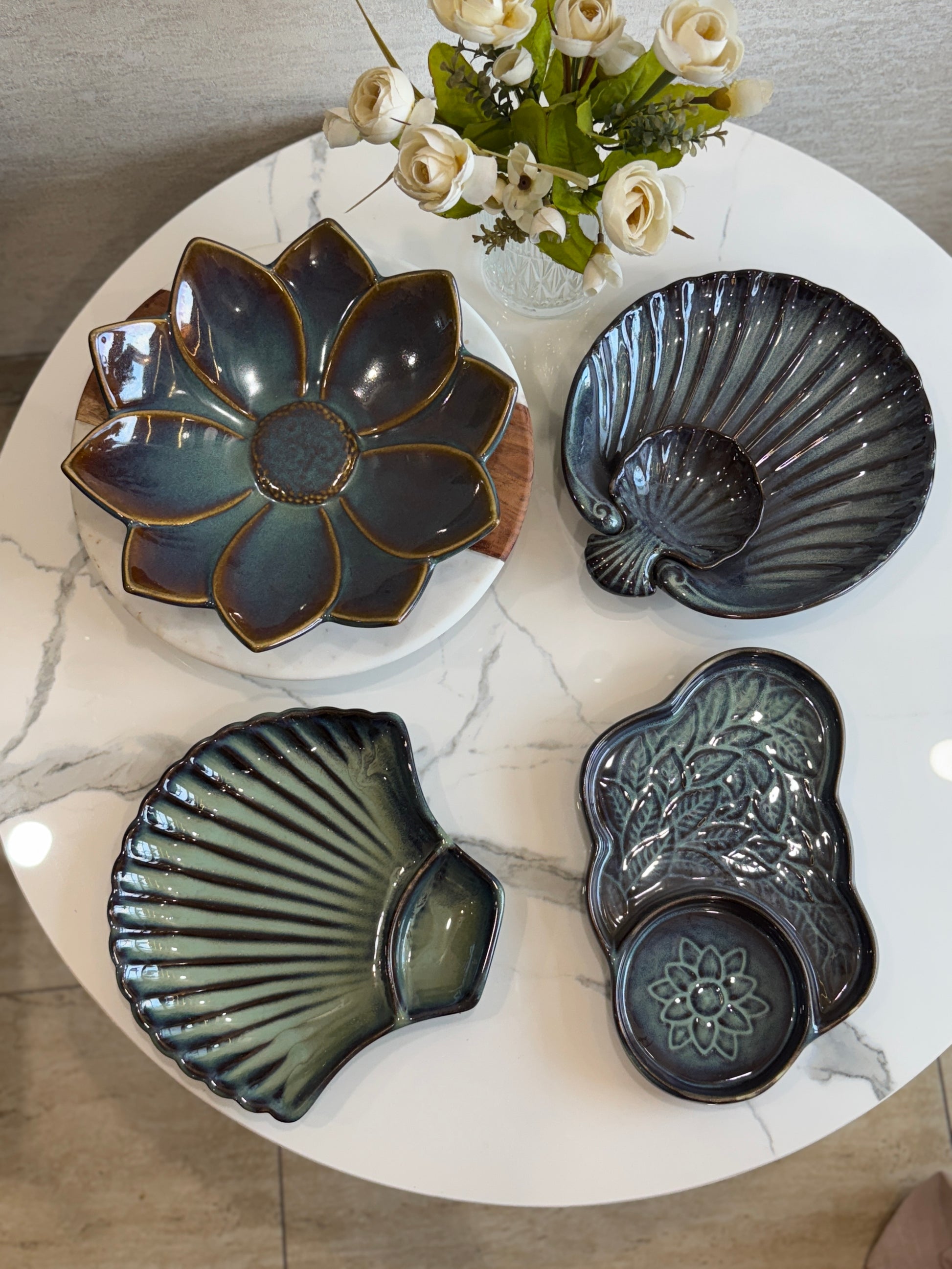 1 large lotus bloom platter in deep jade and indigo hues — a showstopper piece perfect for centerpiece serving.