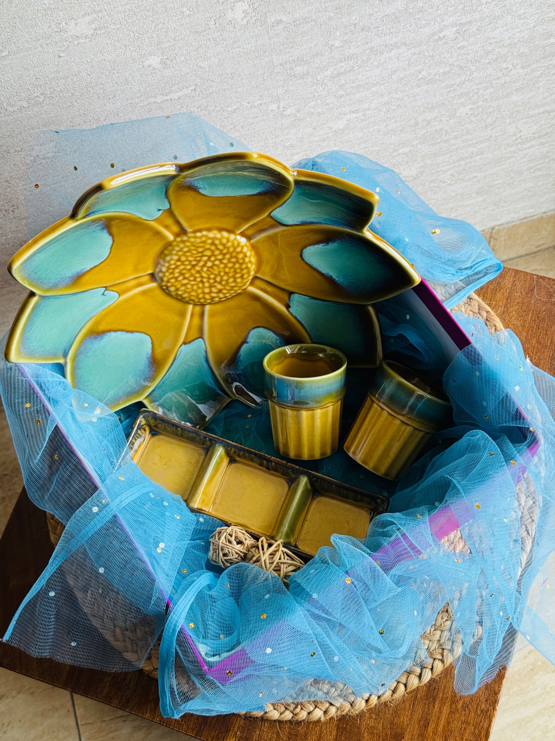 1 Large Floral- Platter: A standout centerpiece with bold petal design in mustard and teal glazes—ideal for serving festive snacks, sweets, or simply enhancing any tabletop with floral charm.