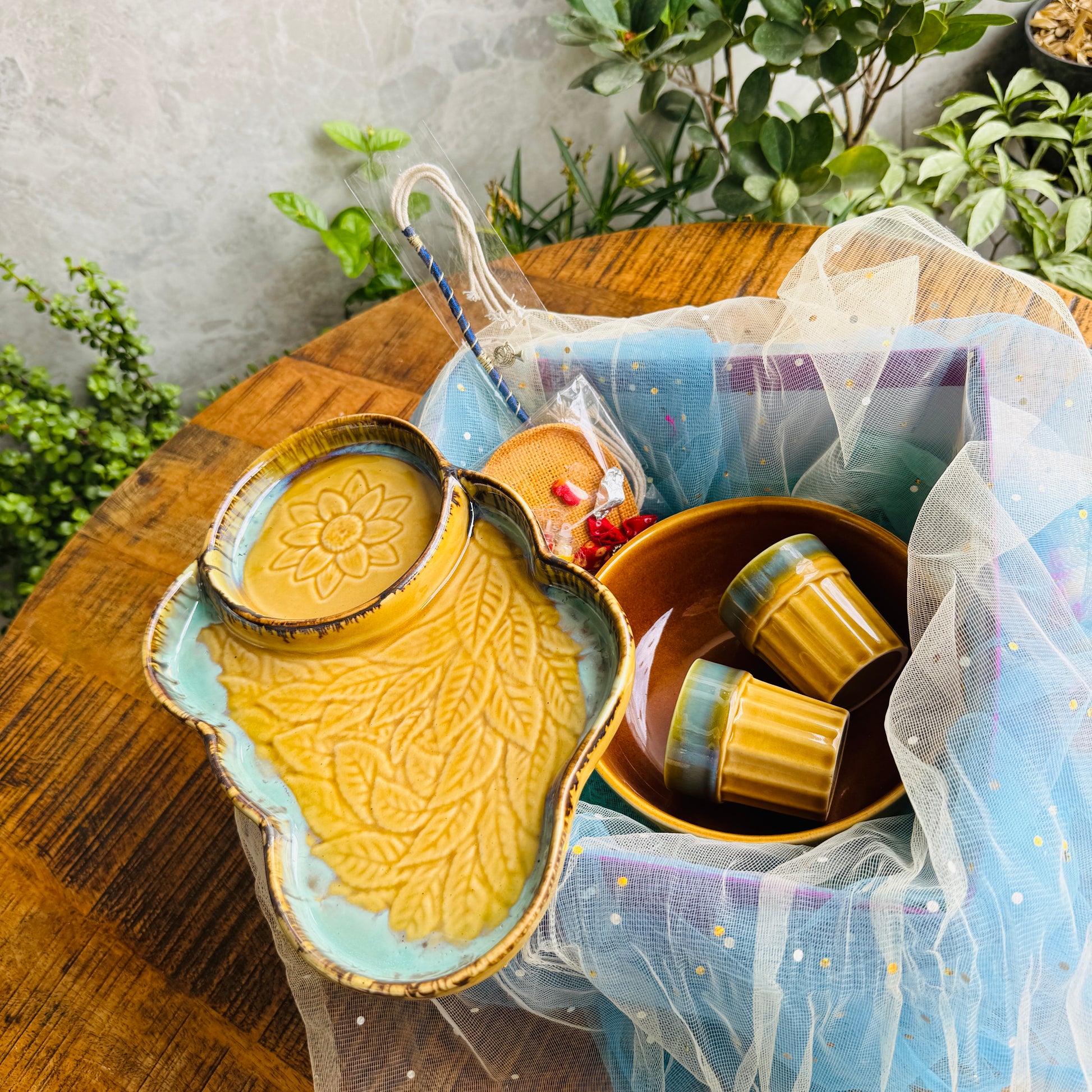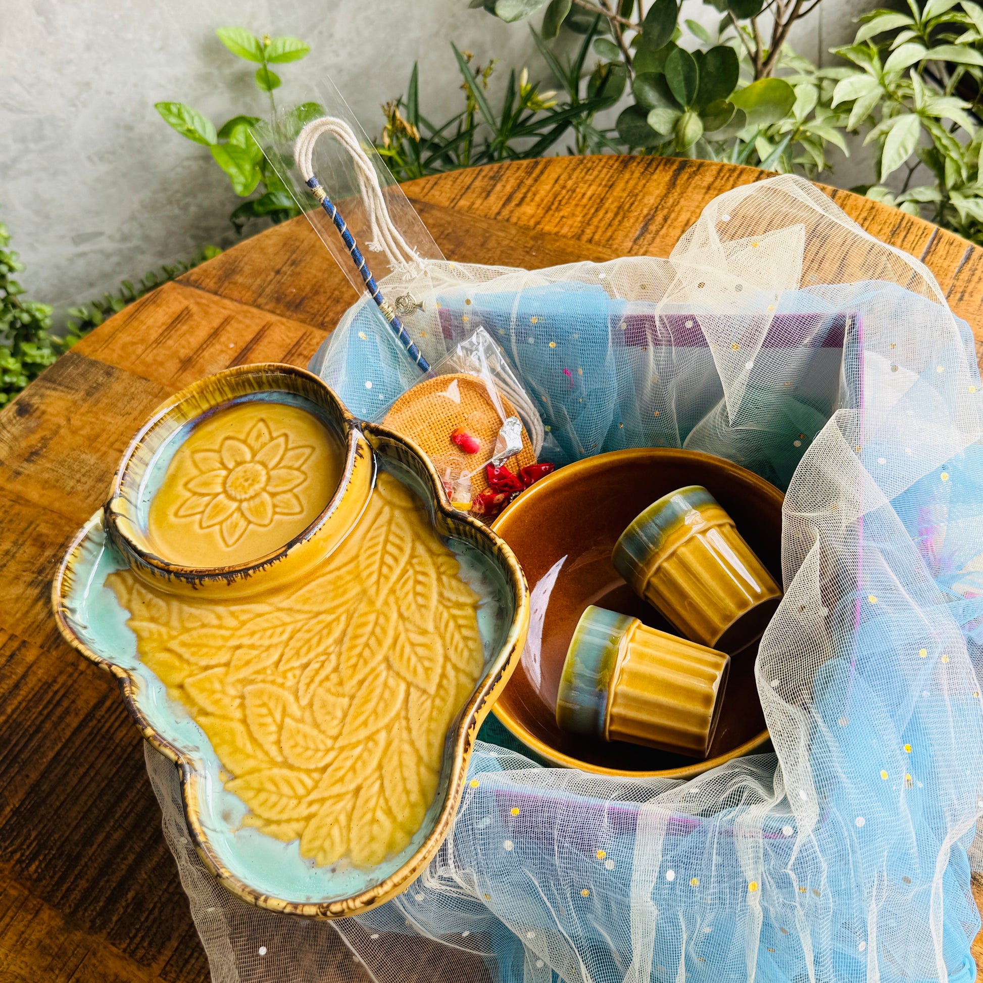 2 Ceramic Kulhad-Style Glass: Glazed in mustard with a splash of ocean blue — ideal for shared chai moments and coffee conversations.