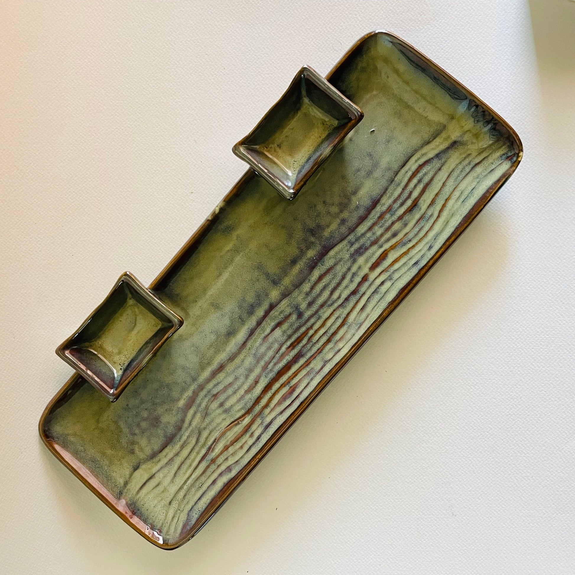 Elevate your dining experience with our elegant Platter. This elongated serving dish features a rich, green hue that brings a touch of nature to your table. Perfect for presenting appetizers, sushi, or a selection of cheeses and fruits. Its sleek, extended shape offers ample space for creative food arrangements while adding a sophisticated accent to any dining setting